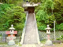 The shrine consists of two structures: the haiden or oratory in the front and the honden or sanctum at the back. Both the oratory and the sanctum have hornlike crossing planks called chigi rising above the roof at both ends. Also five short logs called katsuogi are placed at a right angle along the ridge of the roof. This is typical of a Shinto architectural style called Shinmei-zukuri. As the old structures were destroyed by the 1923 Great Kantō earthquake, they were rebuilt in 1936. The last reconstruction was completed in 1998. The shrine is 10 minutes by walk from Hase Station and 20 minutes by walk from Kamakura Station.