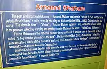 Āmānnisā Khan Nāfisi, also known as Amanni Shahan (Uyghur: ئاماننىسا خان; Chinese: 阿蔓尼莎汗; pinyin: Āmànníshā Hàn; 1526–1560), was a concubine of Abdurashid Khan of the Yarkent Khanate. She is credited with collecting and thereby preserving the Twelve Muqam,[1] which is today considered a musical style of the Uyghur people of Northwest China. The Muqam of Xinjiang has been designated by UNESCO as part of the Intangible Heritage of Humanity.
