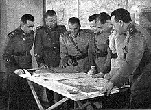 The generals' meeting began at 20:00, with Lindolfo and Zerbini absent.[81] The former would only return from vacation three days later, upsetting Kruel,[83] while the latter avoided the meeting and went to his headquarters in Caçapava to prevent the participation of the regiments from the Paraíba Valley in the coup.[84] At 21:00, Artur da Costa e Silva got in touch with Kruel, who said he was willing to join the coup, but faced the reluctance of generals Morais and Mendes. Costa e Silva would then have convinced both.[lower-alpha 9] Kruel only wanted to participate in the coup after verifying the obedience of the troops and the governors of São Paulo and Minas Gerais having issued their manifestos.[85] If he did not comply, some of his subordinates planned to arrest him and hand over command to colonel Carlos Alberto Cabral Ribeiro, of the 4th Infantry Regiment.[86][87]