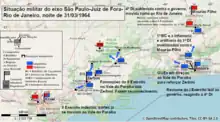On 1 April, the 2nd Army ordered internal control in São Paulo, the march of the 16th Battalion of Hunters from Cuiabá to Brasília, passing through Jataí, and the advance of the forces from São Paulo towards Guanabara through the Paraíba valley.[99] At dawn the valley regiments, until then held back by general Zerbini, began to accept Kruel's authority.[100] In Guanabara, general Ancora's 1st Army sent the School Unit Group to face the São Paulo offensive.[101]