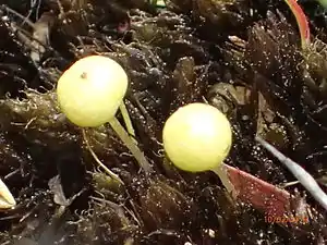 Mature plants are small, pale brown or whitish green when dry. The stems are approximately 2 cm long, and are irregularly and sparsely branched. Leaves on the stem have a broadly lanceolate shape 3.6-4.3 mm long. Spore capsules are whitish-yellow and globose, atop a seta (stalk) that is 1.2 cm long.[5]