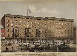 The American House (established 1835) was a hotel in Boston, Massachusetts, located on Hanover Street. Abraham W. Brigham,[4] Lewis Rice (1837–1874),[5][6][7] Henry B. Rice (1868–1888),[8][9] and Allen E. Jones (c. 1921) served as proprietors.[10] In 1851 the building was expanded,[11] to a design by Charles A. Alexander. In 1868 it had "the first hotel passenger elevator in Boston."[12] By the 1860s it also had "billiard halls, telegraph office, and cafe."[13] In the late 19th century it was described as "the headquarters of the shoe-and-leather trade" in the city.[14] Guests of the hotel and restaurant included John Brown,[15][16] Ralph Waldo Emerson,[17] William Whitwell Greenough,[18] Charles Savage Homer,[19] Zadoc Long,[20] and George Presbury Rowell.[21] Many groups held meetings there, among them: Granite Cutters' International Association of America,[22] Letter Carriers' Association,[23] National Electric Light Association,[24] and New England Shorthand Reporters' Association.[25] The hotel closed in 1916, and re-opened under new management in 1918.[1] It permanently closed on August 8, 1935,[26] and the building was shortly afterwards demolished to make room for a parking lot.[27][28][29] The John F. Kennedy Federal Building now occupies the site.[30]