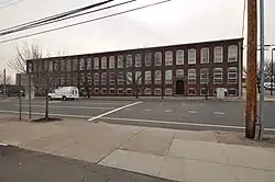 The American Mills Web Shop is located in West Haven's northeastern Allingtown section, extending east and south at the junction of Front Street and Orange Avenue (United States Route 1). The principal elements of the complex are a large weave shed, a single story structure extending along Front Street, and the administrative building, which faces Orange Avenue and is two stories in height. A smokestack and boiler room are located behind these buildings; a more extensive set of outbuildings once also occupied the roughly 5-acre (2.0 ha) parcel, but have been demolished. The weave shed has a particularly well-preserved sawtooth roof, a period innovation that brought daylight to the interiors of large industrial spaces.[2]