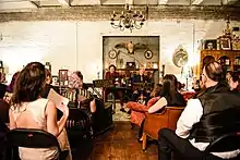 American Murder Song's The Donner Party videos presented the songs by way of a "fictional, Twilight Zone-style show" called "The Black Wagon."[25] This television theme continued on American Murder Song Presents "The Donner Party Reunion Tour," which kicked off in October 2017. The Donner Party Reunion Tour visited 37 cities in North America and welcomed audiences to a live-taping of "The Black Wagon."[26] The tour began with a preview performance at Atlanta's Dragon Con.[27]