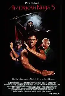 American Ninja V is a 1993 American martial arts action film starring David Bradley and Lee Reyes.[1] It was directed by Bobby Jean Leonard and written by John Bryant Hedber, Greg Latter and George Saunders. It is the fifth installment in the American Ninja franchise. The film is set in Los Angeles, Rome and Venezuela. This film was not originally intended to be part of the American Ninja franchise. Cannon Pictures made it under the title American Dragons (it is even shown on many cable TV stations with this title) but the title was changed to American Ninja V before release. This explains why star David Bradley plays Joe, a different character than the Sean Davidson character he played in American Ninja 3: Blood Hunt and American Ninja 4: The Annihilation. The working title was Little Ninja Man.