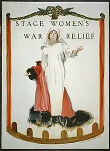 Stage Women's War Relief was founded in 1917 to organize charitable giving in support of the war effort.[1] Its founders, led by playwright and director Rachel Crothers, included the actress and playwright Louise Closser Hale and actresses Dorothy Donnelly, Josephine Hull, Minnie Dupree, Elizabeth Tyree and Louise Drew. The organization established workrooms for sewing uniforms and other garments (with total output totaling 1,863,645 articles), set up clothing and food collection centers, sold Liberty Bonds, and opened a canteen on Broadway for servicemen.[2] It also presented benefit performances to raise money, including some held in a temporary "Liberty Theater" built outside the New York Public Library.[3] In total, the group raised nearly $7,000,000 for the war effort.[4]