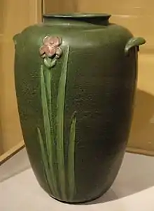 The Roseville Pottery was founded in Roseville, Ohio, in 1890 and moved to Zanesville eight years later. It began by making housewares and only began making art pottery around 1900. Frederick Rhead was Roseville's art director for five years (1904–09). Many Roseville pots carry floral decoration, frequently in low relief. Roseville ceased producing original art pottery in 1953.[17][18]