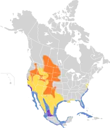 American avocets were previously found across most of the United States until extirpated from the East Coast. The breeding habitat consists of marshes, beaches, prairie ponds, and shallow lakes in the mid-west, as far north as southern Canada.[8] These breeding grounds are largely in areas just east of the rocky mountains including parts of Alberta, Saskatchewan, Montana, Idaho, Washington, Utah, North and South Dakota, Nebraska, Colorado, and even down to parts of New Mexico, Oklahoma and Texas.[11] Their migration route lands them in almost every state in the western United States. The avocet's wintering grounds are mainly coastal. Along the Atlantic Ocean, they are found in North and South Carolina, Georgia and Florida. There are also wintering grounds along the Gulf of Mexico in Florida, Texas, and Mexico, and along the Pacific Ocean in California and Mexico. There are resident populations in the Mexican States of Zacatecas, San Luis Potosí, Guanajuato, Hidalgo, Mexico City and Puebla, and in Central California.[11]