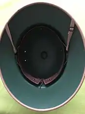 The American pressed fiber sun helmet is known for the simplicity of its design, allowing for easy mass production.[13] An important feature in the original conception of the helmet was to be shaped and contoured from one singular piece. This greatly assisted in making the helmet waterproof. The fiber material kept the helmet light and the soldier unencumbered by headgear. The major drawback in the design was the heat. Despite being designed with a series of ventilation holes, the interior of the helmet would eventually become hot in the sun. The chin straps for the World War II model were made by General Fibre Company and Hawley Products Company, the same fiber liner used in the original M1 helmets.[3] The design of the International Hat and Hawley Product versions of the helmet are almost identical. However, the defining difference in identification is that the Hawley Product model has four folds with a wider space between them in the faux puggaree.[20] A puggaree is a type of Indian turban, namely a thin muslin scarf tied around a sun helmet.[21] The International Hat has five thin folds in its faux puggaree.[20]