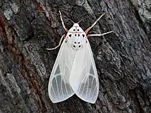 The wingspan is about 50 mm. Adults have translucent white wings. They have black spots on the thorax, and red and orange areas on the legs, hindwings and body. When disturbed, the moth exudes a froth from glands beside the eyes.[1]