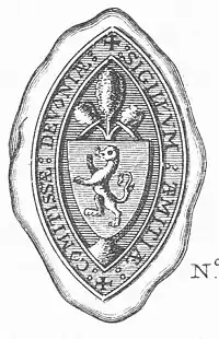 Seal of Amice de Clare. The shield depicts the arms of her husband Baldwin de Redvers, "a lion rampant". The device above the shield is likely to be a heraldic device of de Clare, part of her paternal armourials. Legend: "SIGILLUM AMITIAE COMITISSAE DEVONIAE" (seal of amicia, Countess of Devon)