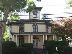 Amos Kelly House is a historic home located at Cambridge Springs, Crawford County, Pennsylvania. It was built between 1873 and 1876, and is large two-story rectangular frame dwelling in the Italianate style. It measures approximately 95 feet by 60 feet. The front facade features a large front porch, overhanging eaves, and a square cupola.[2]