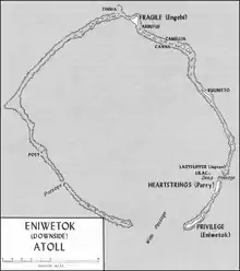 In the late afternoon of November 20, 1943, the submarine USS Nautilus arrived off the coast of Apamama. Remaining submerged, the submarine circumnavigated the atoll examining the islands through the periscope, noting the entrance to the lagoon that was ringed by Entrance Island to the south and Abatiku on the north. Apamama Atoll was chosen for part of Operation Galvanic because of its large lagoon which could provide a base for logistic support to facilitate the western movement of the Pacific Fleet from Pearl Harbor.[25] Codenames were given by the planners for the seizure of Apamama, each a word for the six islets. STEVE for main Apamama Island, forming the northern and most northeastern part of the atoll, and going clockwise; OSCAR, OTTO, ORSON, JOHN, and lastly JOE, which was adjacent to the mouth of the lagoon where Entrance Island is located. Their orders were to scout out the islands by using the cover of darkness; to determine the strength of the defending Japanese forces and select potential beaches for a planned landing for an occupying American force which was following in a few days.[14] The unit was accompanied by Australian Army Lt George Hand formerly of the Ocean Island Defence Force acting as an interpreter.