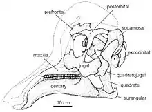 The holotype, or original specimen, consists of only a maxilla (upper jaw bone), and a dentary (lower jaw bone), both from the left side of the same individual. However, most of the other bones of the skull and skeleton have also been preserved in the bonebed, albeit of many different individuals. This other material was described more recently, making Amurosaurus the most abundant and completely known Russian dinosaur.[4]