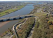 Over the next three years, the District government proceeded to study and design the trail system. During that time it was renamed, with the "and" dropped. They identified 19 different trail segments 16 miles in total length, or 25 miles with expanded elements.[5] The system proposed after design was expanded to include segments south to Blue Plains, north to the Capitol and the Tidal Basin, and with a bridge across the Anacostia at the National Arboretum. The design took advantage of several existing pieces of multi-use facilities including the 0.6 mile River Terrace section (repaved and modified in 2003 when the new Ethel Kennedy Bridge was constructed) and a 0.3 mile trail connection to Heritage Island, both built for the bicentennial;[6][7] the 0.5 mile Navy Yard Promenade built after 1991;[8] a 0.2 mile trail through Southwest Waterfront Park, built in 1968; a 0.2 mile connection over 295 to the Anacostia Recreation Center, originally opened in 1964 and rebuilt in 2009-2010;[9][10] and 2.7 miles of bicycle/pedestrian facilities on the Sousa (built in 1941, and modified for better bicycle and pedestrian access in 1995), Francis Case (built in 1971, with a causeway built by 1993 and modified in 2018) and Ethel Kennedy (built in 2004) Bridges.[11][12][13] However, the Navy Yard Promenade didn't open to the public until April 1, 2011, after the Navy built a fence between it and the facility.[14] Altogether 4.5 miles of trail and facilities existed prior to production of the AWI plan.