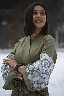 She joined the Armed Forces of Ukraine voluntarily[9] after her fiancé, journalist Oleksandr Makhov, was killed in Kharkiv Oblast in May 2022.[5][10][11][12] At first, she served as a press officer in the Izium battalion of the TDF, and now she holds the same position in the 47th separate mechanized brigade.
