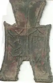 Some think the first Chinese metallic coins were bronze imitations of cowrie shells[2][3] found in a tomb near Anyang dating from around 900 BC, but these items lack inscriptions.[4][5]
