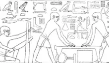 The most useful kind of wood would have come from a tree with straight trunks, sufficient heartwood, and no defects. Before using manufacturing furniture or anything out of this wood, first axes needed to be used to cut down the tree. The lumberjacks would start by cutting down the bottom of the tree. Several other men would catch the rest of the tree after it fell. Once this part of the process had been completed, a new stage would start. After branches, sapwood, and bark were removed, the logs would be cut into smaller and more manageable boards. In order to achieve this, the boards would cleave with mallets and wedges. Saws were used to cut shorter logs that were vertically secured to posts. Egyptians would have cut through logs using a method called through and through cutting. Also, the wood needed to properly be positioned and created. If this was not done the climate of Egypt would cause problems for the furniture and material. The wood needed to be kept away from sunlight as this might result in unwanted drying. Fitting lids, firm joints, and unwarped boards of furniture were used to season the timber. This was because other forms required more advanced tools. Once this process was completed, the beams were placed on a simple lumber stack. This allowed for natural air drying. Sometimes this resulted in microbial organisms growing, causing the material to decay. Other times the material simply changed shape. Whilst cutting, logs would be strapped to a trestle. This trestle supported the log by using a horizontal beam held up by two splayed legs. This was done to make cutting logs safer for the workers.[51]