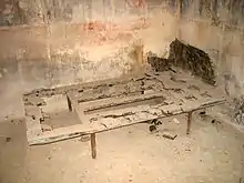 Although there were beds in Sumeria, most people slept on the floor rather than beds.[8] The Sumerian bed was a wooden bed on a wooden frame. The bed frame was a tall head-board decorated with pictures of birds and flowers.[9] Sometimes the bed's leg would be inlaid with precious metals and shaped to look like animal's paws.[2] Some Akkadian beds had ox-hoof feet.[6] The upper class in Sumeria would use leather, cloth strips, carefully woven reeds to form the sleeping platform.[10] Wealthy Mesopotamians had beds with wooden frames and mattresses stuffed with cloth, goat's hair, wool, or linen. The marriage bed was an important kind of bed in Sumeria. It was where couples engaged in sexual intercourse after a marriage. If the bride did not get pregnant, the marriage could be invalidated.[10]