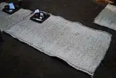 People would cover their floors with mats woven from reeds, skin rugs, and woolen hangings.[11][12][13] During the early parts of Sumerian history, reed mats would be fastened to sticks and stuck into the ground or houses. Sometimes reed-mats were used to make houses.[14] The roofs of certain houses would be flat mud spread out over mats. These mats would be supported by cross beams. Another way of supporting these huts was to tie bundles of reeds together and bend the top inwards. These bundles would serve as arches.[15] Some food would have been sprayed over mats. For example, one Sumerian text explains that a person should spread cooked mash over reed mats. Other Sumerian texts talk about covering chariots in reed mats.[16] Mats could have also been used to cover skeletons.[17]