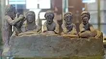 The substantial number of personnel in these workshops should not lead one to suppose that they worked all together in one place, in a sort of "manufacture". With one exception, "even for serial activities, one cannot properly speak of vast workshops, the production work was not carried out with factory-like structures."[40] What is known of the craftsmanship of this period, "either from the remains left by the workshops on the ground, or from representations in paintings of ceramic vessels, proves that the workers could be counted on the fingers of one hand."[41] It can thus be concluded that the hundred or so slave armorers of Cephalus were undoubtedly distributed in several different workshops, whose production was specific and sold separately.[note 4]