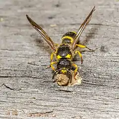 Nest building occurs during the spring and early summer. These nest consist of holes in wood or tubes, commonly in elder and bramble stems, with clay partitions. These potter wasps lay an egg in each cell where they put various paralysed small caterpillars of micromoths, mainly Tortricidae. When the eggs hatch the larvae consume the prey.[3]