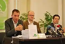 Schiffer and Bernadett Szél were elected co-presidents of the LMP during the party's congress on 24 March 2013.[16] The seven party MPs were able to re-establish the LMP's caucus on 1 September 2013, after the decision of the Committee on Immunity, Incompatibility and Mandate. Schiffer said the newly former LMP parliamentary group became the first group in Hungarian history with a female majority.[17] On 18 July 2015, Schiffer and Szél were re-elected co-presidents of the party.[18]