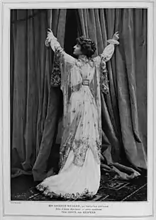 Mégard was considered "tall, graceful, and distinguished looking."[6] Her hairstyles[7] and the designs of her costumes, hats, and gowns were reported in detail,[8][9] internationally,[10] often with photographs or drawings showing their features.[11][12][13] She was especially known for wearing the creations of Redfern, the English design house.[14] A New York writer in 1906 declared of the Paris theatre scene that "Even the critics themselves, disdainful of the pieces they have had to comment upon, turn their clever pens to the question of clothes."[15] "Madame Mégard has for many years back been one of the recognized beauties of the French stage, and as such as earned more than one succés de jolie femme," commented a London writer in 1907, "but it is only recently that her power as an actress has been fully realized."[16]