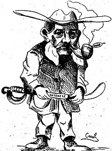 ![]() Caricature of Andrés Baquero. In his hands he holds a sabre with the name "Antonete", due to a controversy of the time about the authenticity of the weapon that was then exposed in the Provincial Museum as belonging to the revolutionary Antonio Gálvez Arce. | |