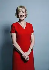 Dame Andrea Jacqueline Leadsom DBE (/ˈlɛdsəm/;[1] née Salmon; born 13 May 1963) is a British politician serving as Member of Parliament (MP) for South Northamptonshire since 2010.[2][3] A member of the Conservative Party, she has served as Parliamentary Under-Secretary of State for Public Health, Start for Life and Primary Care since November 2023.[4][5] She previously served as Secretary of State for Environment, Food and Rural Affairs from 2016 to 2017, Leader of the House of Commons from 2017 to 2019 and Secretary of State for Business, Energy and Industrial Strategy from 2019 to 2020. Leadsom has twice run to become Leader of the Conservative Party, in 2016 and 2019.