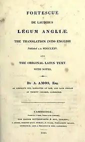In 1825 Amos edited for the syndics of the University of Cambridge John Fortescue's De Laudibus Legum Angliæ, appending the English translation of 1775, and original notes, or rather dissertations, by himself. These notes are full of antiquarian research into the history of English law. His name is familiar in the legal world through the treatise on the law of fixtures,[3] which he published in concert with Joseph Ferard in 1827 when the law on the subject was wholly unsettled, never having been treated systematically. He found a congenial part of his task to consist in the examination of the legal history of heirlooms, charters, crown jewels, deer, fish, and "things" annexed to the freehold of the church, such as mourning hung in the church, tombstones, pews, organs, and bells.