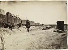 Russell took his first photographs with a camera that he borrowed from Fowx and Colonel Herman Haupt. Haupt used Russell's photographs to illustrate his reports. Haupt arranged to have Russell removed from his regiment on March 1, 1863, so that he could photograph for the United States Military Railroad and the Quartermaster Corps, until he mustered out in September 1865.[2] Russell was the only military officer to photograph for the War Department during the Civil War. He is perhaps best known for "Confederate dead Behind the Stone Wall" and another photograph stated before taken during the Battle of Chancellorsville on May 3, 1863.