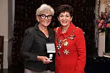 Vivienne Leachman (left) receiving the New Zealand Antarctic Medal from the governor-general, Dame Patsy Reddy, on behalf of her late husband, at Government House, Wellington, on 30 April 2019