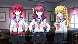 It has three plot lines for the characters Yui, Masami Iwasawa and Matsushita.[3] Throughout gameplay, the player is given multiple options to choose from, and text progression pauses at these points until a choice is made. To view all plot lines in their entirety, the player will have to replay the game multiple times and choose different choices to further the plot to an alternate direction.[2] A map feature is also included allowing the player to interact with character in whatever order they chose. The game includes 200 hidden achievements.[4]