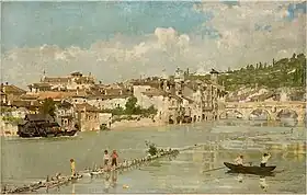 A pupil of Napoleone Nani at the Cignaroli Academy in Verona from 1873 to 1876, the painter attended the course of nude studies at the Venice Academy of Fine Arts at the same time. A meeting with Giacomo Favretto had a marked impact on his early work, which moved towards pleasant genre painting set in Verona. It was in 1880 that his naturalistic output was influenced by a new interest in photography, which was to develop further through contact with the painter Francesco Paolo Michetti during a stay in Rome in 1882. He began to present works at the major national and European exhibitions, enjoying great success with the public and critics alike, in 1883. Participation in the Paris Universal Exhibition of 1900 coincided with a renewal of artistic vocabulary through the adoption of elements drawn from Divisionism and Symbolism and a broad awareness of developments on the European scenes. The first urban views, characterised by bright colours and bold contrasts, appeared in this connection. His career reached its peak in 1912 with a solo show of some 80 works within the framework of the Venice Biennale.