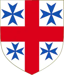 Coat of Arms of the Anglican Catholic Church of Canada: Argent a cross Gules between four Maltese crosses Azure, with the motto, “USQUE AD TERMINOS ORBIS TERRARUM” meaning “To the ends of the earth” (Psalm 72:8).