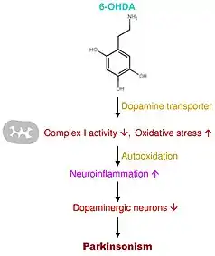 - ↑ Rodriguez-Pallares, J.; Parga, J. A.; Muñoz, A.; Rey, P.; Guerra, M. J.; Labandeira-Garcia, J. L. (2007-06-15). "Mechanism of 6-hydroxydopamine neurotoxicity: the role of NADPH oxidase and microglial activation in 6-hydroxydopamine-induced degeneration of dopaminergic neurons". Journal of Neurochemistry. 103 (1): 070615193023005––. doi:10.1111/j.1471-4159.2007.04699.x. ISSN 0022-3042. PMID 17573824. S2CID 20714033.
