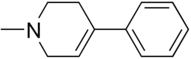 1-Methyl-4-phenyl-1,2,3,6-tetrahydropyridine (MPTP) is a widely used neurotoxin in Parkinson's disease research (Figure 4). In contrast to 6-OHDA, MPTP crosses the BBB which making the neurotoxin even more selective for dopaminergic neurons. Due to the ability to cross the blood-brain-barrier, MPTP is administered peripherally, subcutaneously. This neurotoxin is known to replicate oxidative stress, ROS, energy failure, and inflammation; which are all hallmarks in Parkinson's disease. However, it does not produce Lewy body pathology. The mechanism of action of MPTP is due to its conversion to 1-methyl-4-phenylpyridinium (MPP+) caused by the interaction of MPTP with monoamine oxidase B (MAO-B). (Figure5). MPTP enters astrocytes and is metabolized to MPP+ before being released. Once released into the extracellular space, MPP+ is taken up into the neuron by DAT and is stored in vesicles by the up take of vesicular monoamine transporter (VMAT2). In the neuron, MPP+ inhibits the function of complex 1 of electron transport chain, which decreases ATP production and releases ROS.