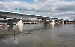 The construction began in June 2017 and was finished by December 20020.[2] The bridge consists of two independent structures running parallel, each carrying four traffic lanes and a separated pedestrian and cycling path. Its total length spans 1.5 kilometers running above the floodplain, extending 342 meters on the left (western) bank and 628 meters on the right one.[3] The western part of the bridge was constructed using the incremental launching method, the part in the river using the balanced cantilever method and the eastern one using a movable scaffolding system.