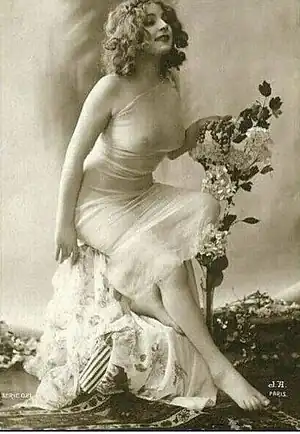 Many of her film roles were Pre-Hays Code, in which she appeared in see-through sheer clothing semi-nude. Her first film was an unnamed party guest in Ethel's Roof Party (1914), quickly followed by Ethel Has a Steady (1914).[5] In 1915 she appeared in ten films including: Beth Slade in Light o' Love, Lib in The Fable of the Through Train, Mrs Drummer in Home Again,[6] and Senorita Ynez in At the Stroke of the Angelus. Her other films included Favorite of the Harem (uncredited) in Intolerance (1916);[7] Mrs Dana in The Truant Soul (1916); Mrs Dibby in The Five Dollar Bill (1917); Mary Elizabeth in The Lighted Lamp (1917); a French peasant girl in Hearts of the World (1918);[7][8] Amanda Garcia in With Hoops of Steel (1919),[9] and Pauline in The Trembling Hour (1919). She played the nude Rudy in Bare Fists (1919), was Flozella in The Desert Flower and the Duchess in As Man Desires, both in 1925. Her last film was as Mazzie in The Fighting Marine (1926).[10]