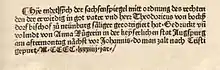 Hye endet sich der sachsenspiegel mitt ordnung des rechten den der erwirdig in got vater und herr Theodoricus von bockßdorf bischof zu neünburg säliger gecorrigieret hat. Gedruckt und volendt von Anna Rügerin in der keyserlichen stat Augspurg am aftermontag nächst vor Johannis. do man zalt nach Cristi gepurt/M.CCCC.lxxxiiij.jar./