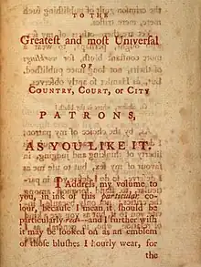 The introduction is printed in red ink and ends with "Parnassus Valley, April 1, 1768."[4][6] The decision to use red ink in the printing is addressed in the text, that she wanted it to be "particularly red", which is a play on words explored by Dr. Kristyn Leuner in her article on the digitization of the work.[7]