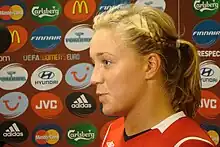In October 2008 Giske made her senior international debut for Norway against Russia. She was selected for UEFA Women's Euro 2009, and scored the second goal in Norway's 31 quarter final win over Sweden.[7] Giske had been named an alternate for the 2008 Olympics.[3]