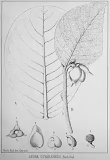 | Botanical illustration of Annona dioica using they synonym A. cuyabaensis[1] | |