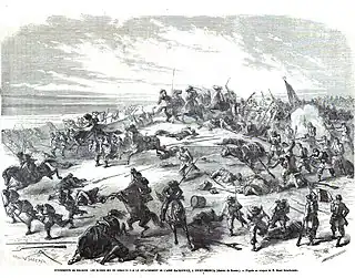 Later his unit merged with Bolesław Dłuski's party and on March 27 both units victoriously defeated a larger Russian unit near Miegėnai.[15] On March 27, the units led by Mackevičius fought against four Russian infantry companies and one cavalry squadron near Naujaberžė.[3] After the fight both divisions separated. Dłuski went towards the forests of Krakės, where he joined major Tomasz Kuszłejko's unit. Mackevičius together with 120 men went towards Kaunas. On April 19, he joined forces with the joint rebel army led by Zygmunt Sierakowski.[3] Both soon clashed with Russians on 21 April during the victorious battle of Genėtiniai.[15] Mackevičius' scythemen distinguished themselves in the battle of the Raguva forests on April 21.[3] On April 26, Mackevičius fought in the battle of Karsakiškis, located in the forests of Karpis and Komaras, in the Panevėžys County.[3] After this battle, several commanders active in the area joined forces under Sierakowski's command. According to Puzinas, Mackevičius was appointed commander of the 4th battalion,[3] while according to Kozłowski, he was the 3rd battalion's commander.[15] Soon, it was detached by Sierakowski for special tasks — destroying archives, taking over county coffers and others.[15] On May 3, Mackevičius group was near Kamajai, while the next day, a part of his group was in Rokiškis.[3] At the time, Sierakowski began marching towards Dünaburg in Courland and Mackevičius commanded the right-wing. Because of that, he took part only in the battle of Šniurkiškiai, i.e. the last part of the three-days long battle of Biržai, during which Sierakowski's brigade was defeated and destroyed. After the failed battle on May 8/9 near Gudiškiai, where Sierakowski was wounded and captured, Mackevičius' unit went from the Panevėžys County to the Raseiniai County.[3]