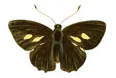 (Description of A. a. ampyx) Upperside: Antennae white, brown at their extremities. Thorax, abdomen, and wings brown; the anterior wings having two oval straw-coloured spots placed near the middle, and the anterior edges of the posterior ones streaked with the same colour.