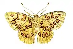 Underside: Palpi, breast, legs, and abdomen straw coloured. Wings straw coloured, being spotted and streaked with red brown, each of these markings appearing to have a gold spot or streak in its centre, forming a very beautiful and singular appearance. Margins of the anterior wings entire, but of the posterior ones a little dentated. Wingspan 1+3โ4 inches (44 mm).[2]