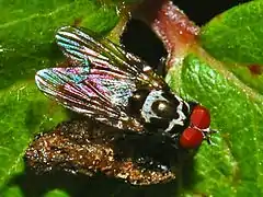 These flies prefer wooded habitats and hedge rows. They fly from Spring to autumn and love sun bathing. They feed on nectar, pollen and excrements. Larvae are associated with bird's nests and feed on bird droppings.[4][7]