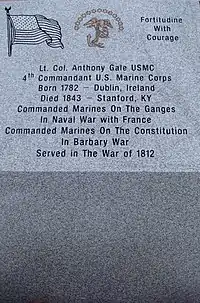 Although some sources identify he died on December 12, 1842,[34] most sources,[3][4][35] including the April 1844 pension petition filed by his widow,[36] report his death to be on December 12, 1843. Over the years, several efforts have been undertaken by the Marines in an attempt to locate Commandant Gale's final resting place. All have proven unsuccessful.[1] In lieu of a monument at his gravesite, on March 6, 2010, various detachments of the Marine Corps League of Kentucky dedicated a monument to Commandant Anthony Gale at the Lincoln County Courthouse in Stanford, Kentucky, near where he died and is likely buried. The Marine Corps League, Department of Kentucky, has taken, as an annual project, the traditional laying of the Commandant's wreath at this memorial on each November 10, the birthday of the Marines,[37] in accordance with Chapter 6 of Marine Corps Order 3040.4.[38]