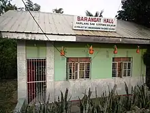 The name of a congresswoman is included in a barangay hall signage in San Ildefonso, Bulacan.